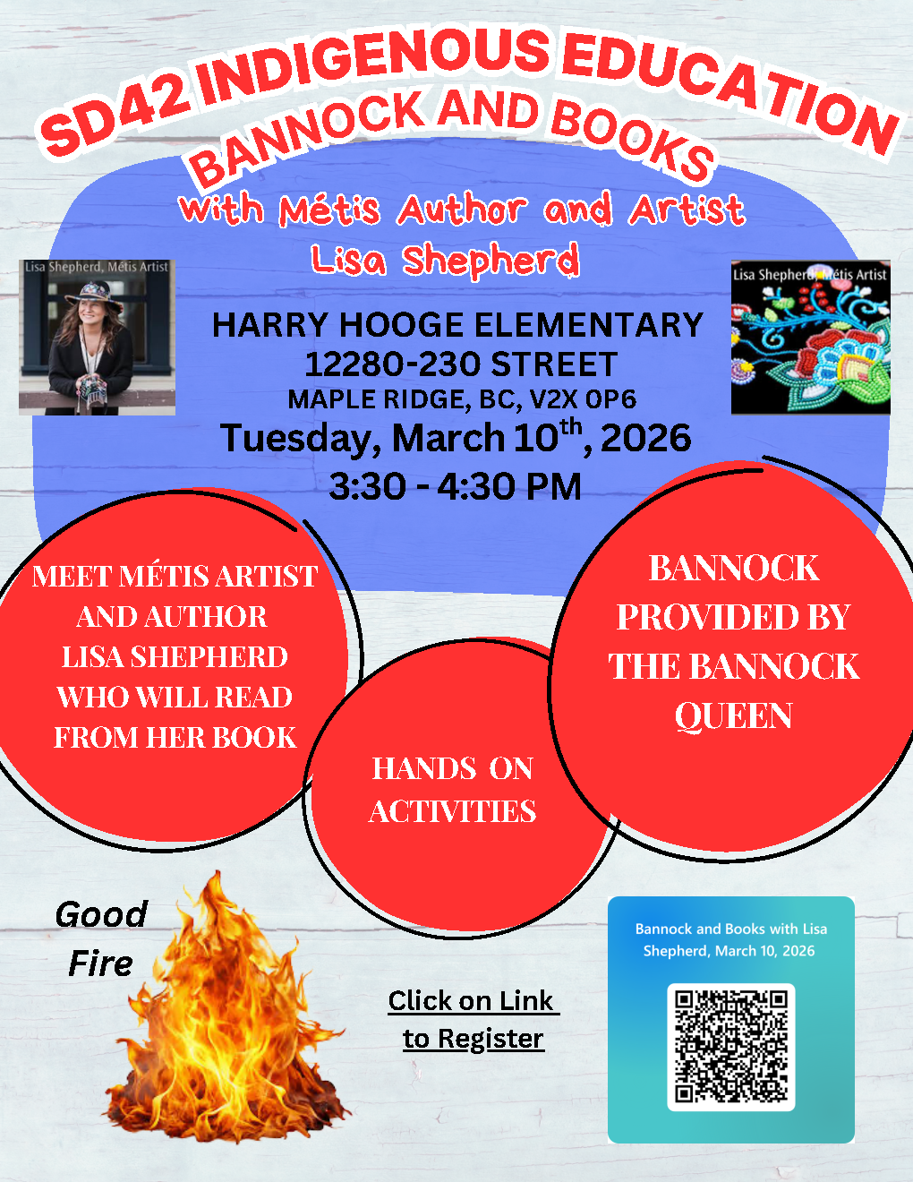 Bannock and Books with Métis Author and Artist Lisa Shepherd The third SD42 Indigenous Education Bannock and Books is Tuesday, March 10, 2026 from 3:30 to 4:30 pm @ Harry Hooge Elementary.