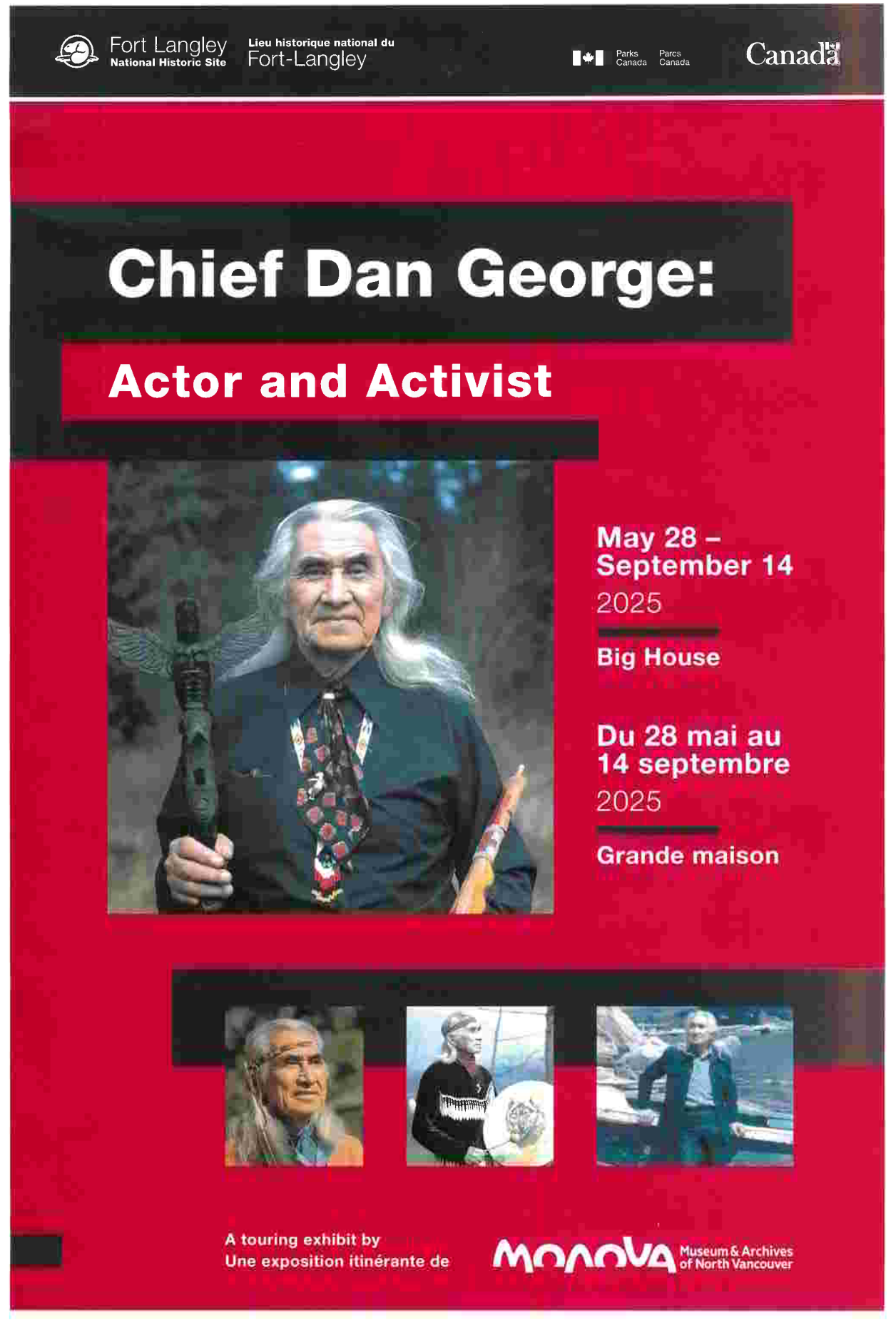 Fort Langley National Historic Site is proud to present Chief Dan George – Actor and Activist, a powerful touring exhibition created by MONOVA: Museum and Archives of North Vancouver, opening Wednesday, May 28, 2025.
