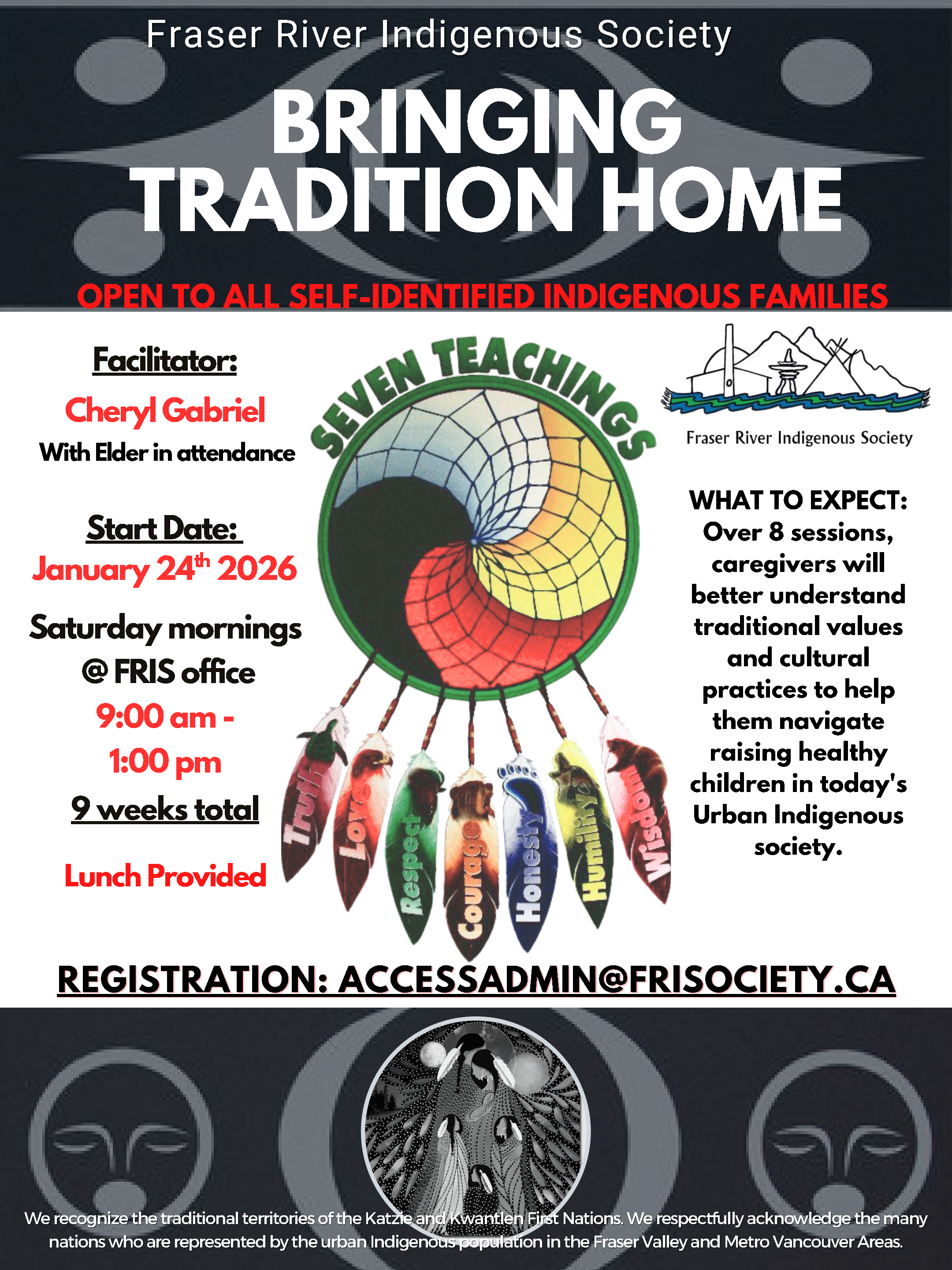 The Fraser River Indigenous Society (FRIS) Bringing Tradition Home Parenting Program starts Saturday, January 24th, 2026 at the FRIS office (11830 223rd Street, Maple Ridge).